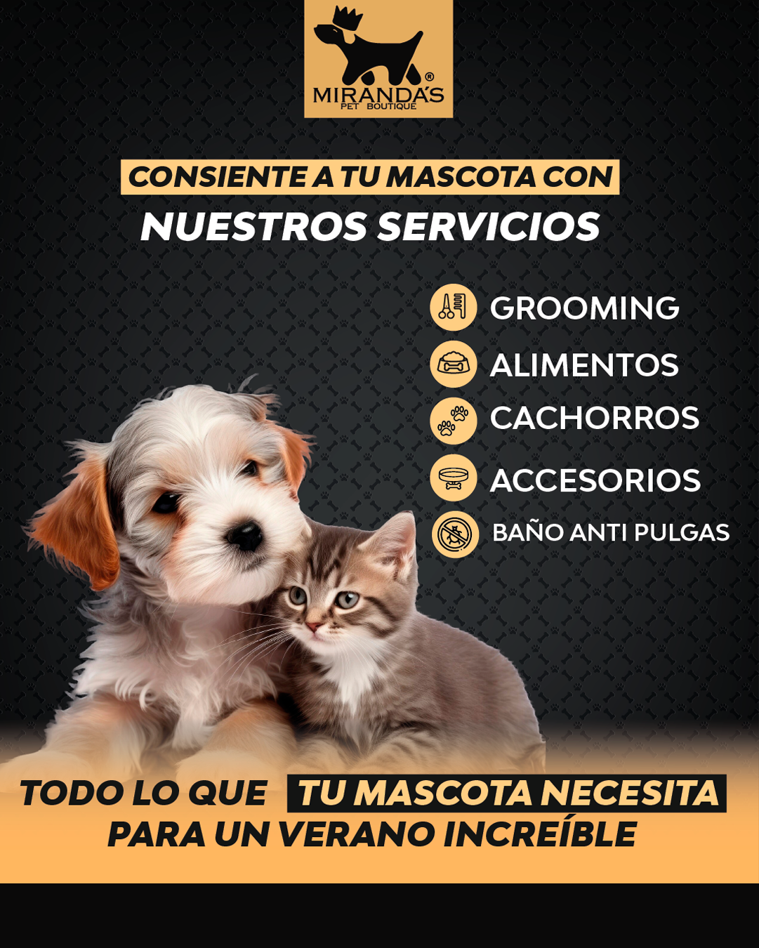 En Miranda ́s Pet Boutique, nos comprometemos a proporcionar atención de alta calidad a cada mascota que nos confíen, combinando cuidado experto y amor genuino para asegurar su bienestar y felicidad.